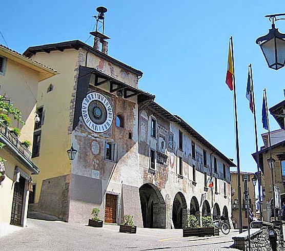 Il Palazzo comunale, con la facciata ricoperta da affreschi tardo gotici, è attiguo alla Torre dell’orologio.